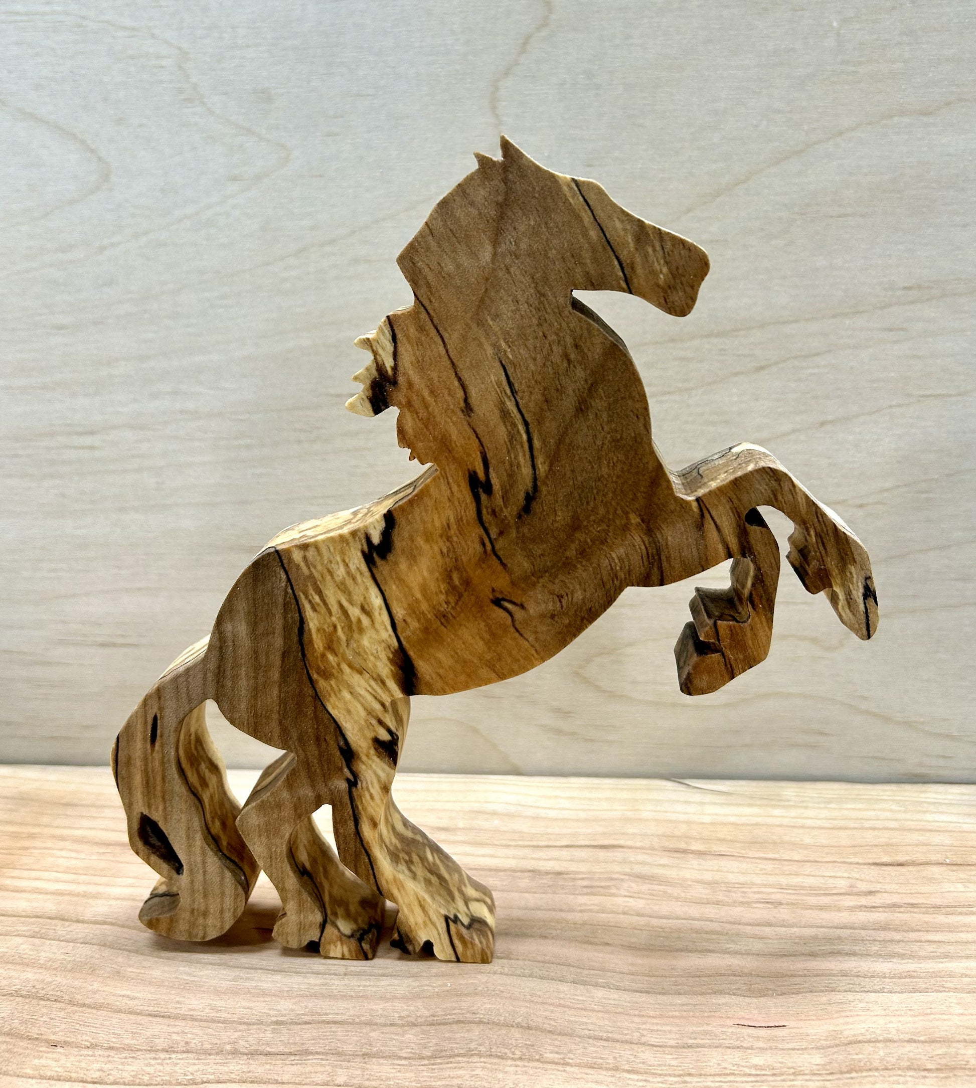 This whimsical stunning horse is cut individually on our scroll saw. Each piece is unique because of the handcrafted work. The horse is able to stand alone. The details in the figure is outstanding from the mane to the feet raised in in the air.
